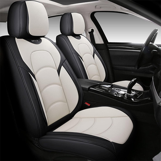 NS YOLO seat covers offer universal fit with stylish black and white faux leather, designed to protect your car seats year-round. Easy to install, waterproof, and compatible with airbags for maximum safety.